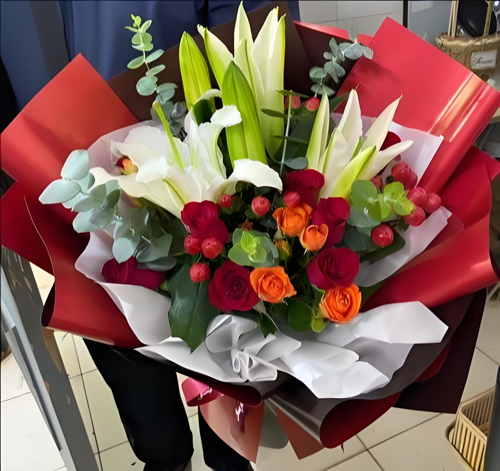 杭州拱墅区花店包11枝红玫瑰、2枝多头白百合、6枝橙色多头玫瑰、红豆、尤加利叶